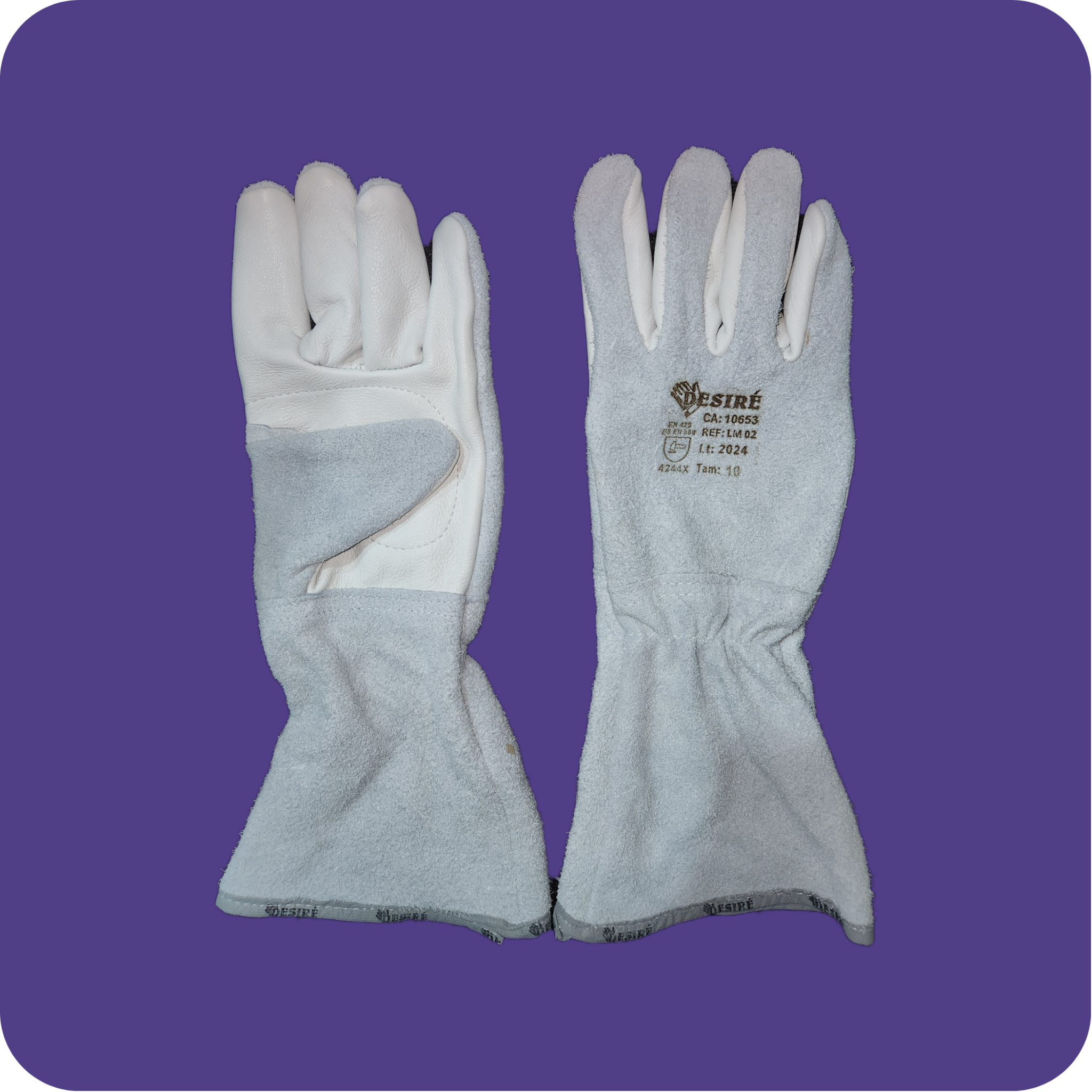 Especificação de Confecção: Luva de Vaqueta Mista – Luva de segurança, confeccionada com Palma em Vaqueta, Dorso em Raspa, reforço interno entre os dedos polegar e indicador, elástico de ajuste embutido no dorso, reforço interno na palma